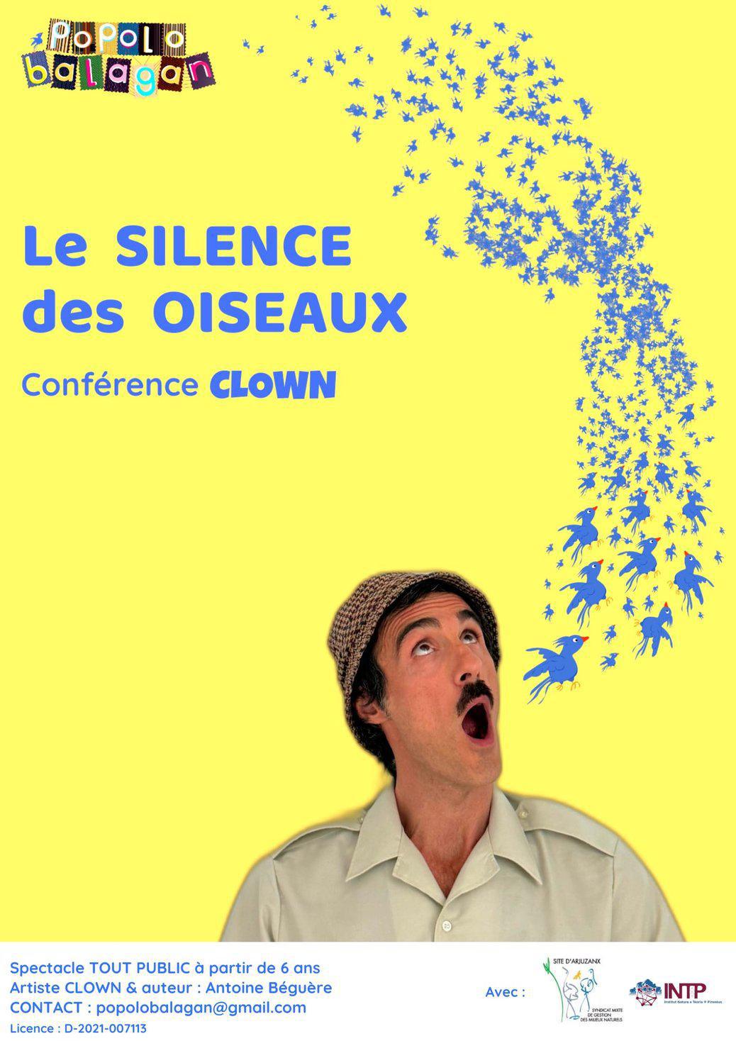“Le Silence des Oiseaux” est un spectacle de clown en solo sous la forme d’une conférence scientifique loufoque.